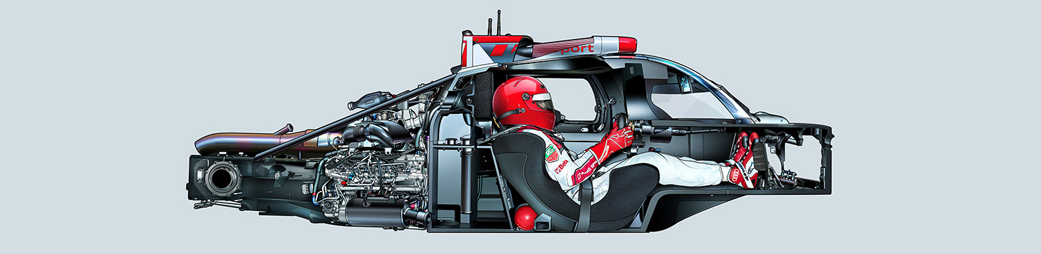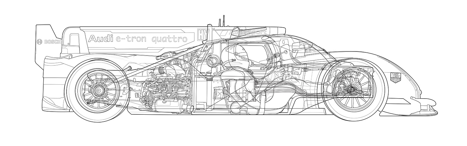 Technical Illustration of the Le Mans winning Audi R18 E-Tron Quattro for Road & Track.