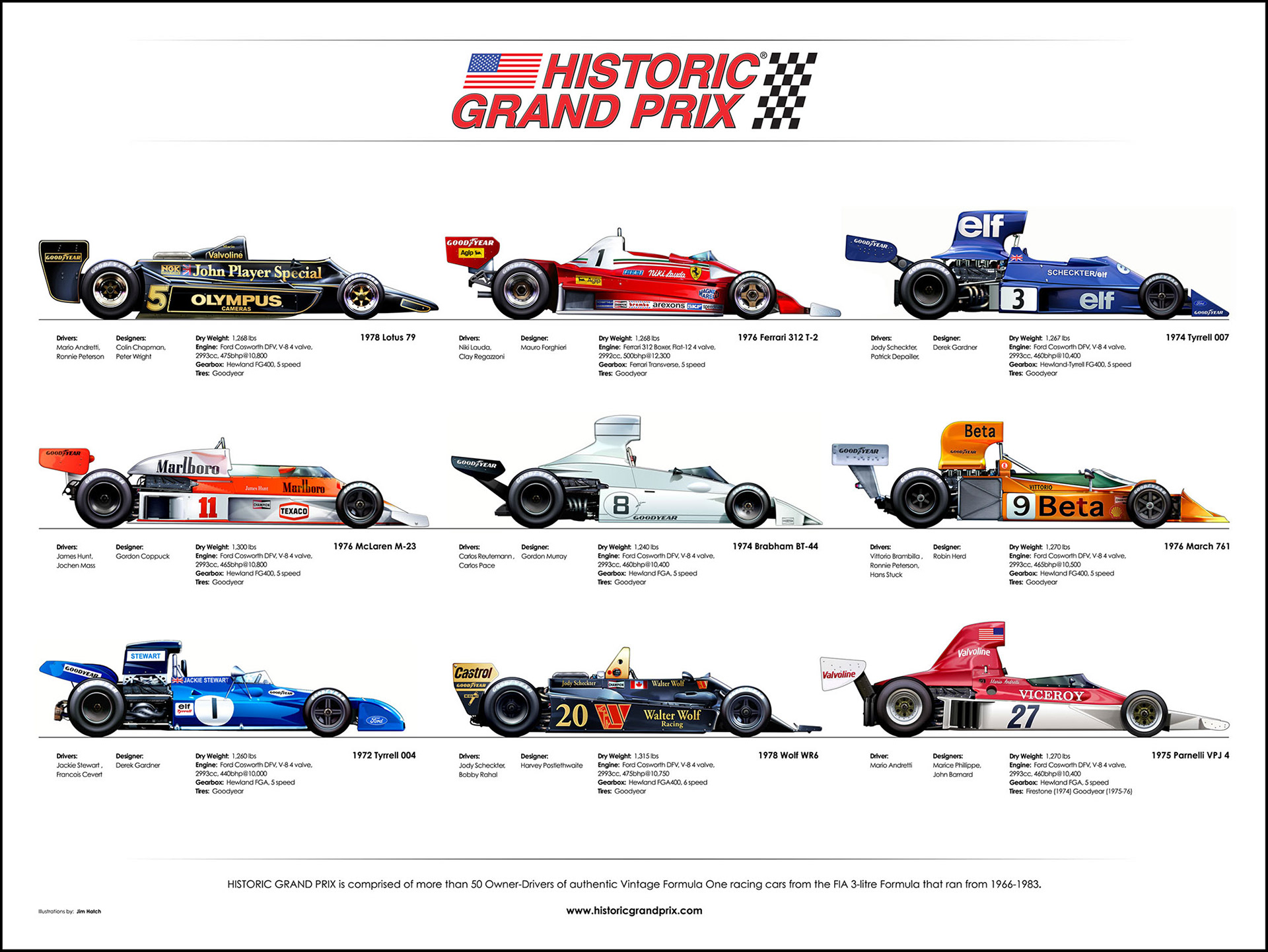 Vintage Formula One, F1 race cars from the FIA 3-Litre era 1966-1983.