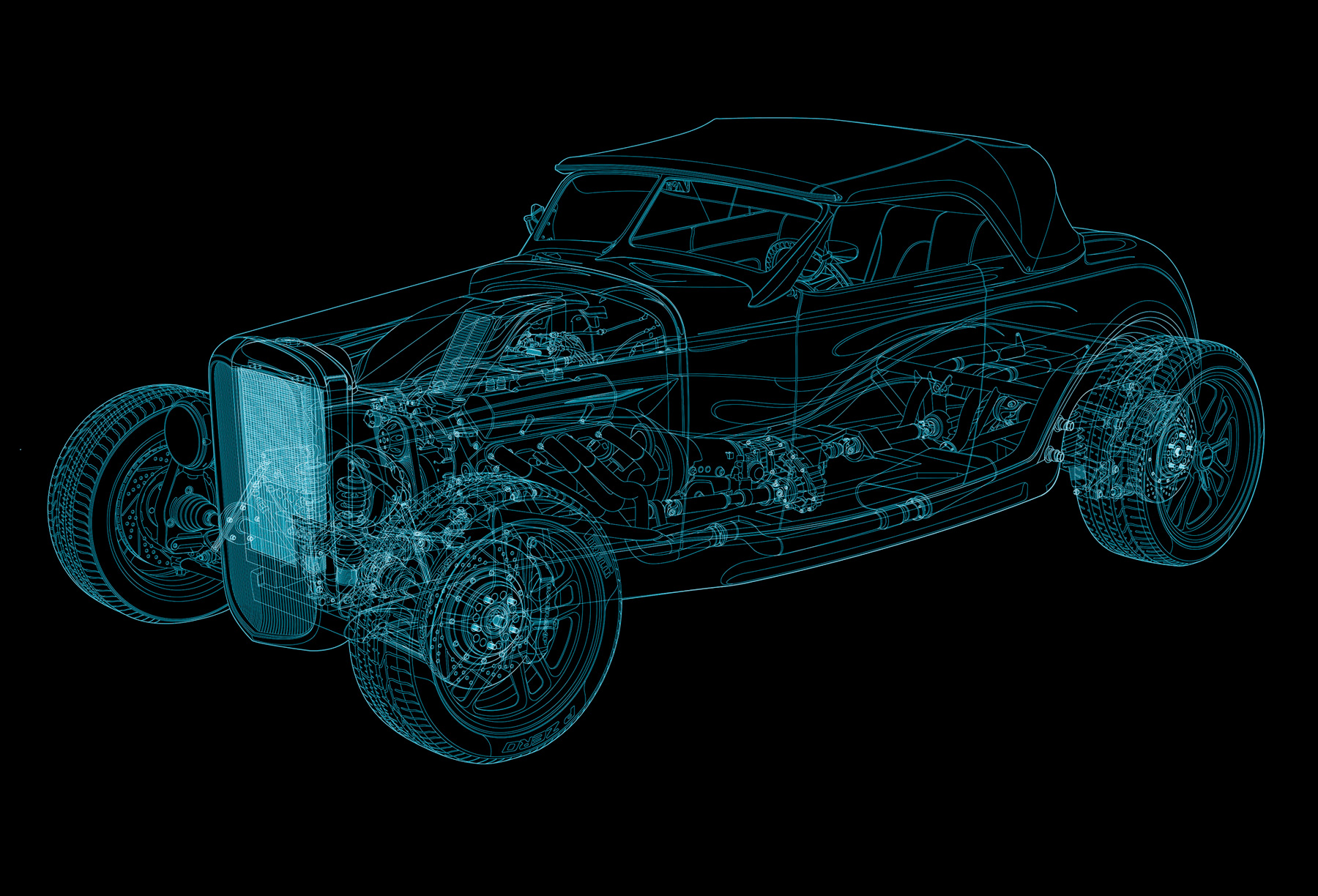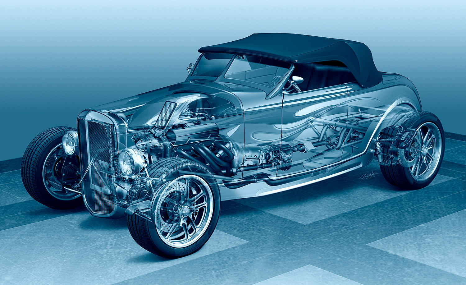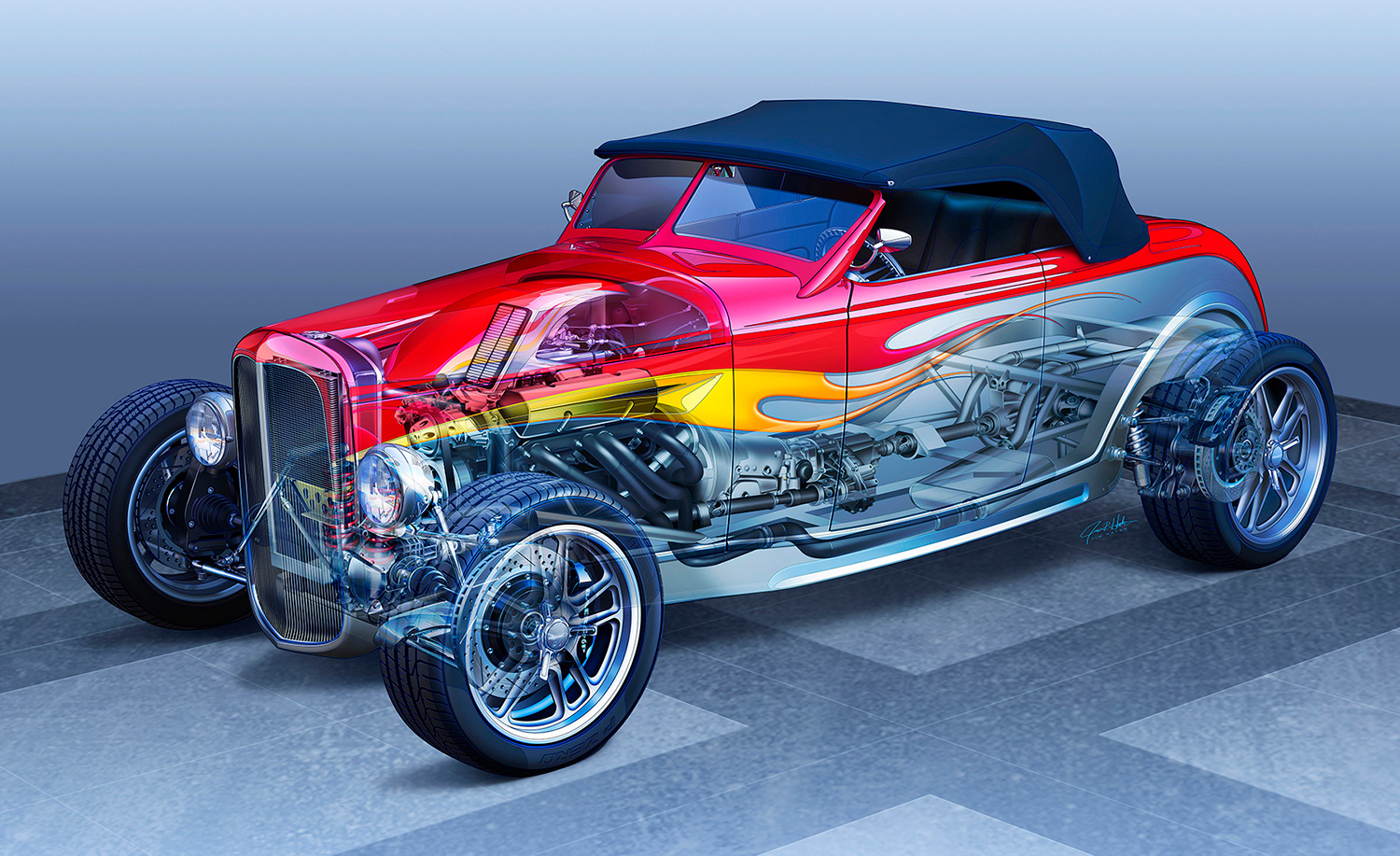 Technical Illustration of the all wheel drive QuadraDeuce hot rod. All drawn by hand with limited internal reference using Adobe Photoshop with a Wacom Table on an iMac Pro..