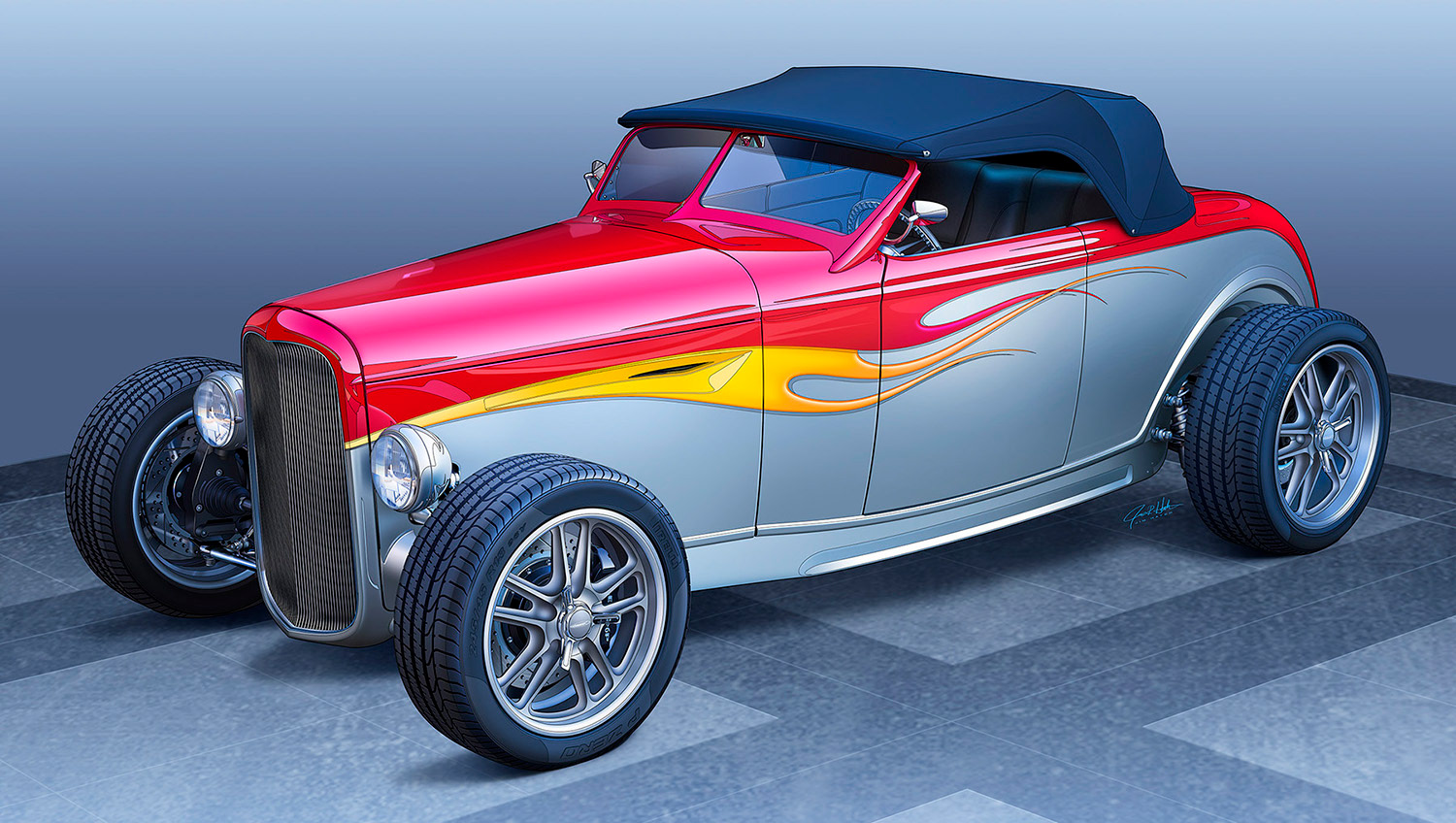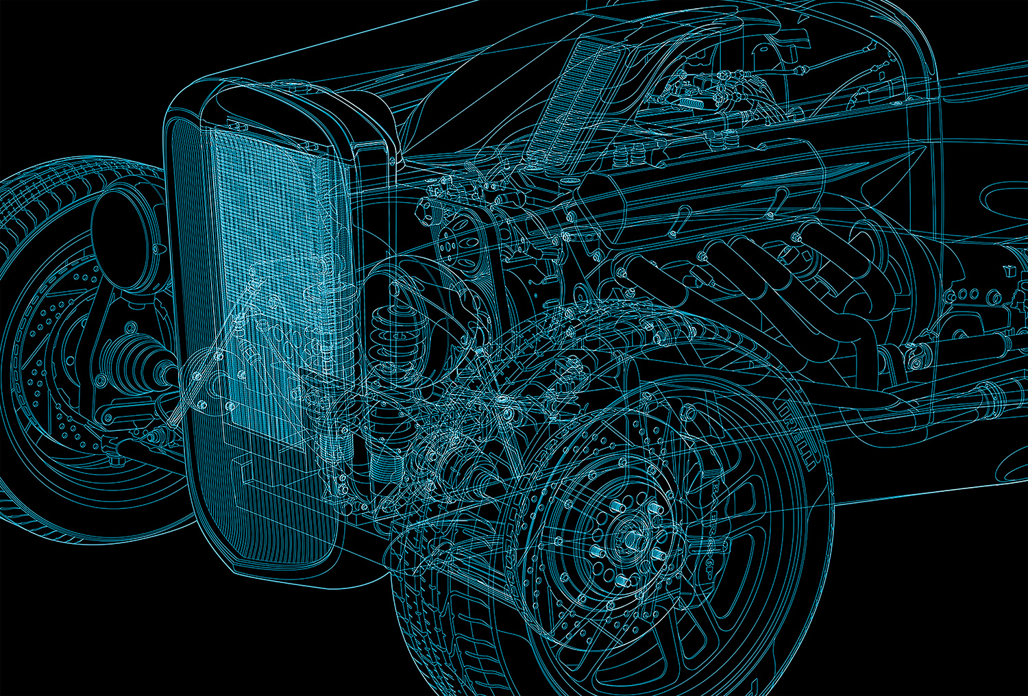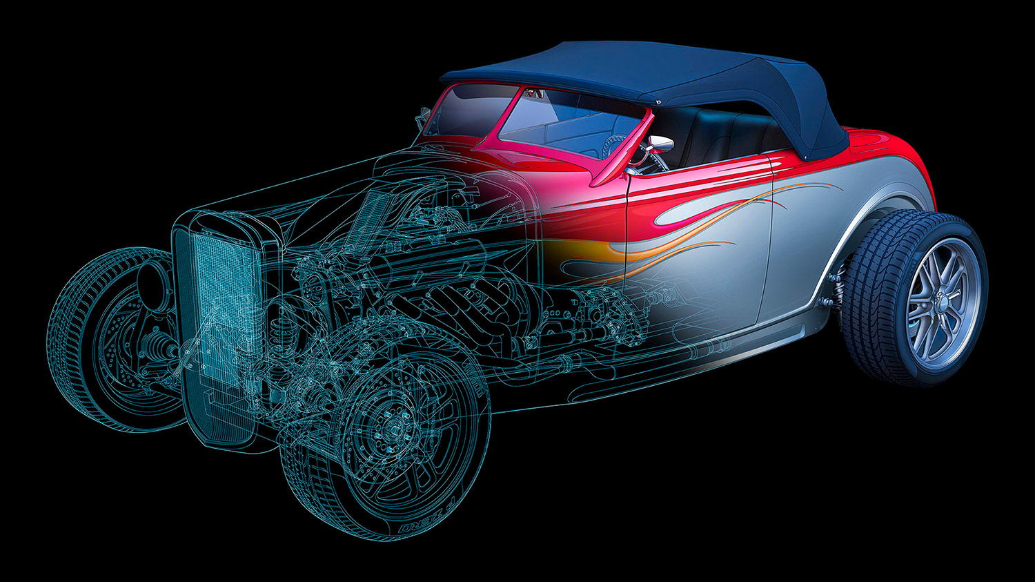 Technical Illustration of the all wheel drive QuadraDeuce hot rod. All drawn by hand with limited internal reference using Adobe Photoshop with a Wacom Table on an iMac Pro..